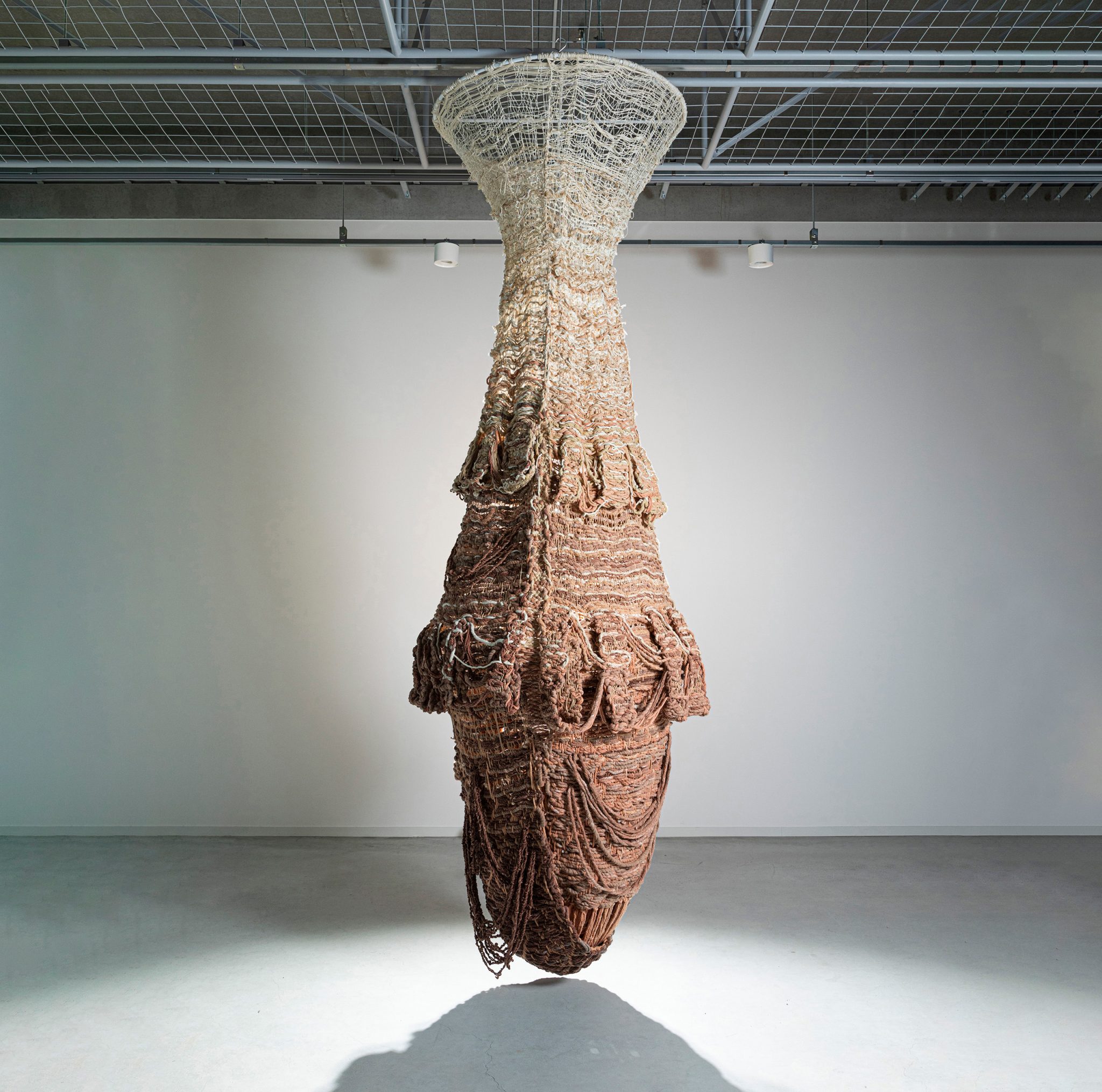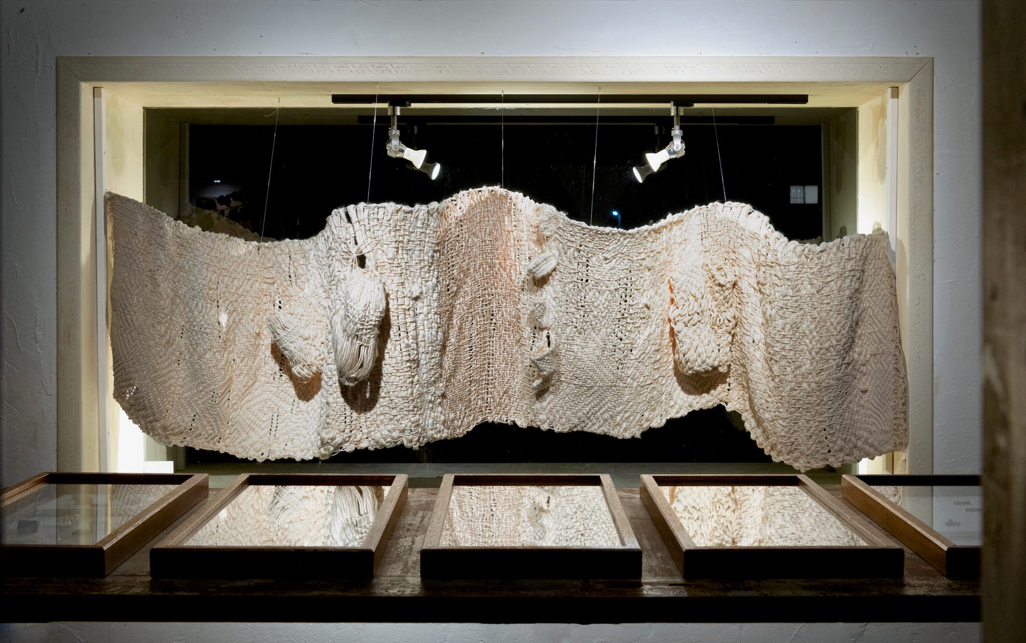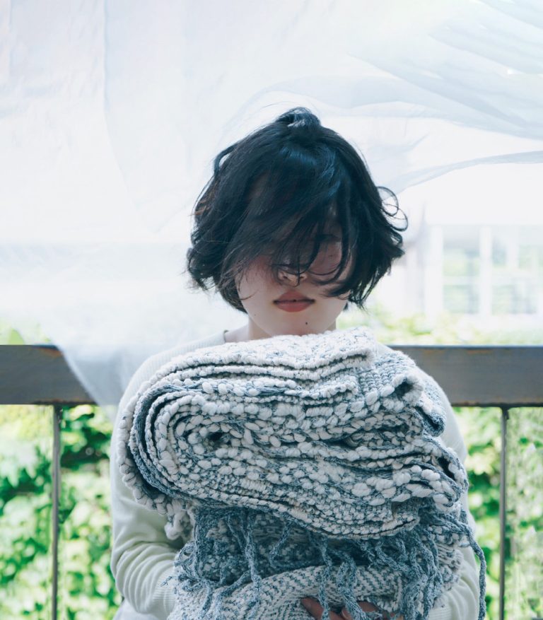 石渡は、すべての布が織の構造からできていることに着目し、織物の技法を用いた布作品を手がけている。糸を撚り合わせ、土で糸を染めるところから制作をはじまる。0.5ミリメートルから1センチメートルの太さや質感の異なる糸を使用し、布の構造が現れるように織り続ける。文明が生まれる前の原初の美しさを、作品を通して追求していると石渡は言う。出展作品の《Tabula Rasa》はラテン語で「空白の板」を意味し、心や意識が芽生える前の、何も書き込まれていない状態を表す。身体スケールを超えた巨大な織物の塊には、未知の物体と対峙しているような、不思議な生命感が宿っている。