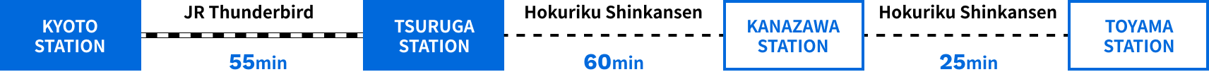 Toyama Sta. → Hokuriku Shinkansen (Kagayaki, Hakutaka, or Tsurugi; 20 min.) → Get off at Kanazawa Sta.