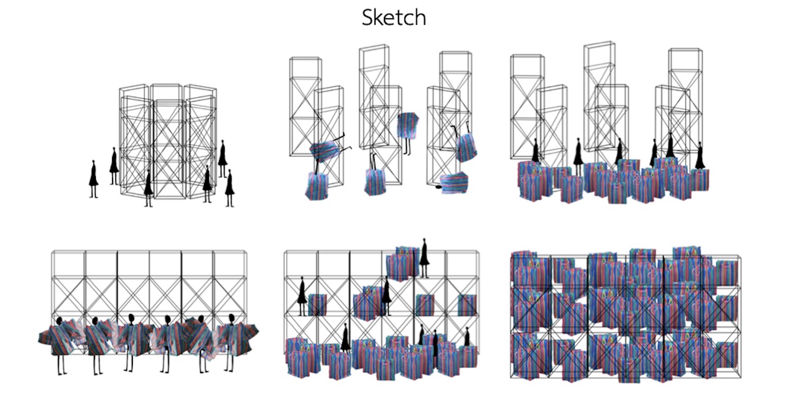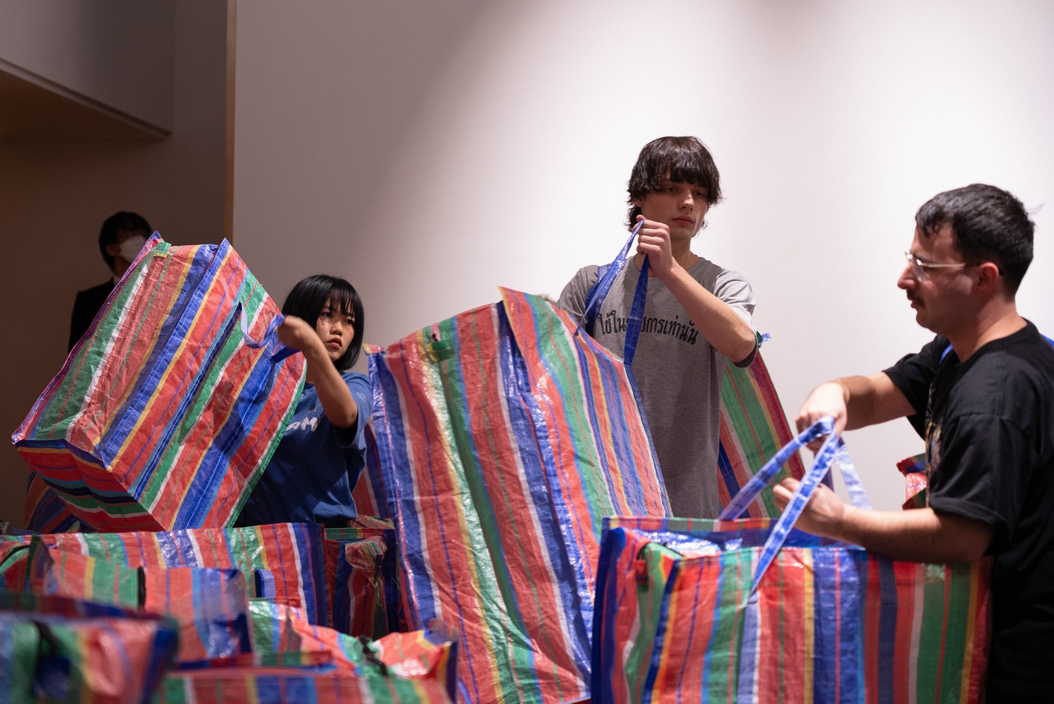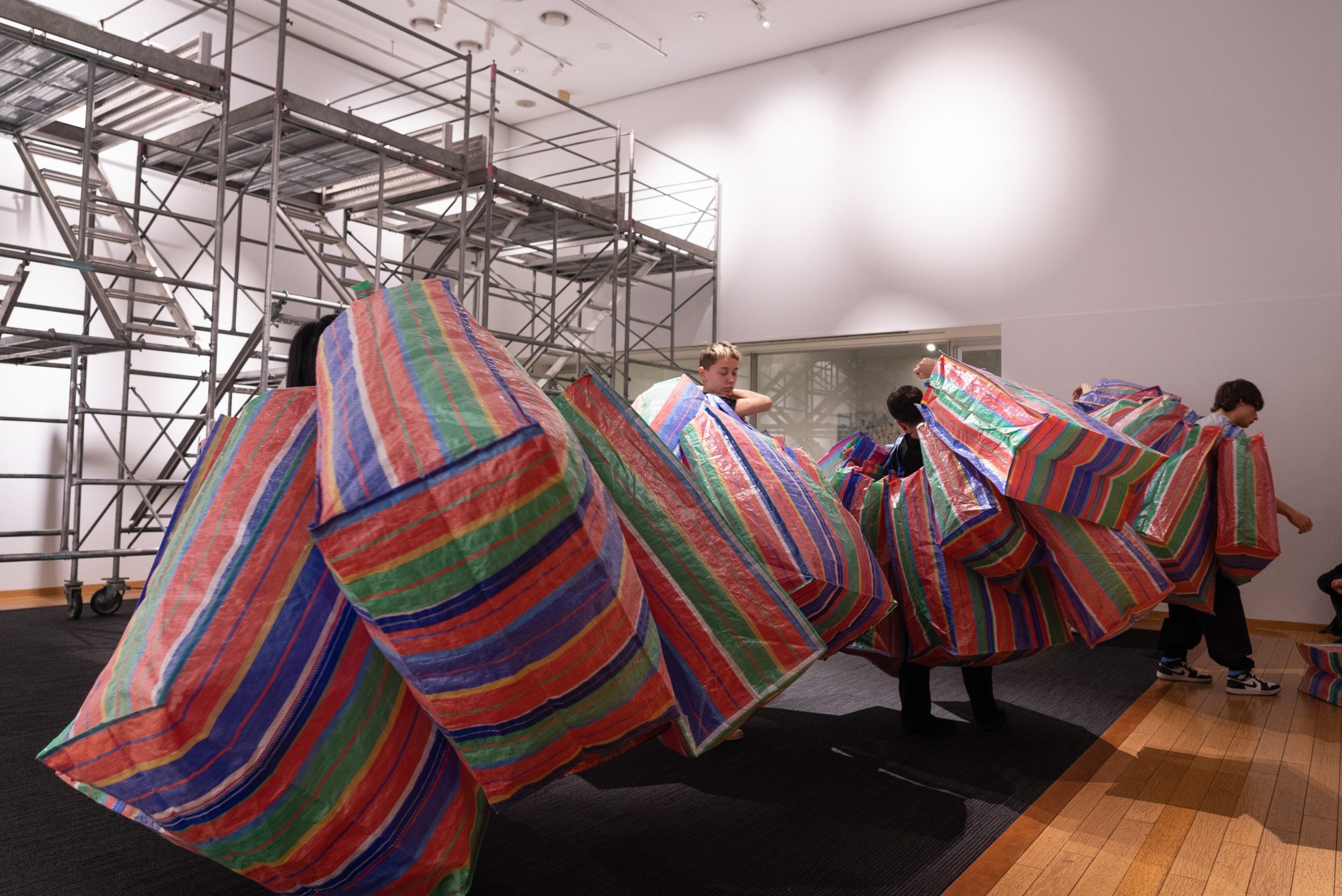 サリーナー・サッタポンさんは、これまでタイの少数民族出身という背景や、日常生活のインスピレーションから作品を制作してきました。社会の目に見えない構造を、鮮やかなインスタレーションやパフォーマンスによって表した作品を手がけ、出品作品は住む場所を追われた際に家財や荷物を持ち運ぶバッグと、工事現場で使用される仮設足場で出来ています。これは、自然災害や感染症、戦争、経済的問題などの要因によって、居場所や故郷となる場所を失った人々の存在を表しており、同時に誰しもが当事者になりえる事をも暗示しています。